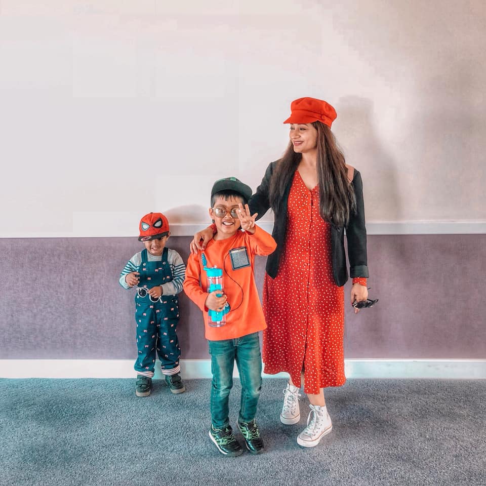 Love Boden t- he red dress and trousers really suit you and how cute are those dungarees on your boy?!